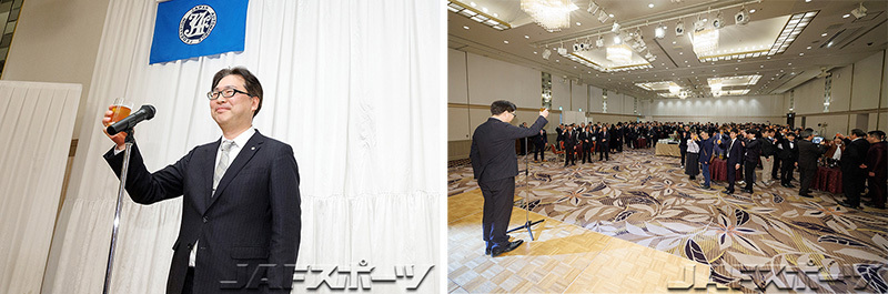 続けてJAF本部モータースポーツ部の大野普及振興課長が「2025年の競技を終え、本日表彰されます皆さまにおかれましてはそのご活躍に対しまして心より敬意を表します」と、所用により表彰式への出席が叶わなかった村田浩一部長のお祝いのメッセージを代読。「新しい年が皆さまにとって素晴らしい年になることを祈念いたします」と、乾杯の音頭を取った。