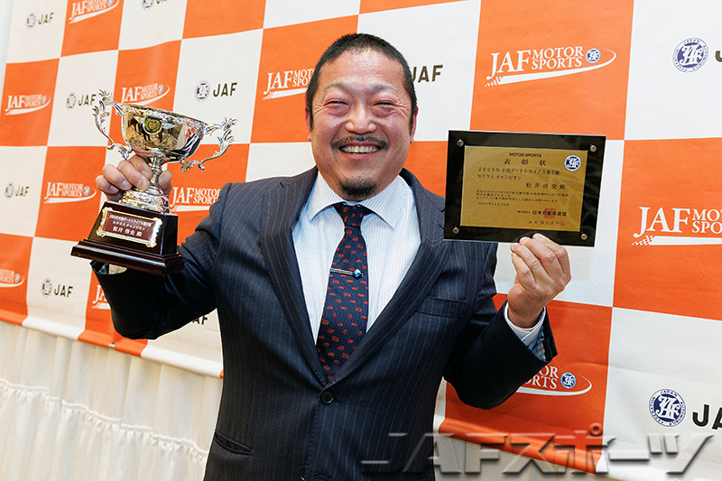 「大変うれしいですね!」と、チャンピオンとして懇親パーティーで文字通り美酒を堪能した様子で、赤ら顔で上機嫌に応えてくれた名倉選手。これまでダートトライアルは遊びの延長で楽しんでいたようだが、2024シーズンにシリーズ2位の悔しさを味わい、2025年はタイトル奪取に向けて真面目に取り組んだという。「楽しさは目減りしましたが、純粋にスポーツとして真剣にやろうと頑張りました」と語る。その甲斐あって最終戦では勝ってチャンピオンを決めた。「2025年のCUSCO &Winmax &DUNLOP・Bライセンス競技若手育成支援プログラムのサポートを受けられたことも大きいですが、とくに伊藤木型さんには大変お世話になりました。伊藤木型さんがあったからこそ、自分がチャンピオンを獲れたんだなってすごく思います」と周囲のサポートに感謝しきりの名倉選手。そして今シーズン、目標として全日本選手権で勝つことを掲げた。「PN3クラスで全戦出場し、まずはひとつ勝ちます。ゆくゆくはシリーズチャンピオン目指します」と抱負を語った。