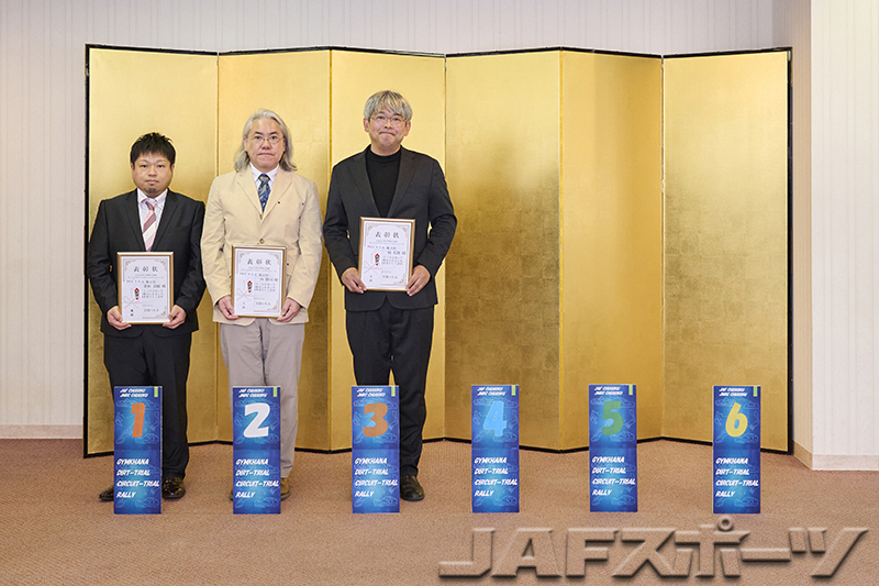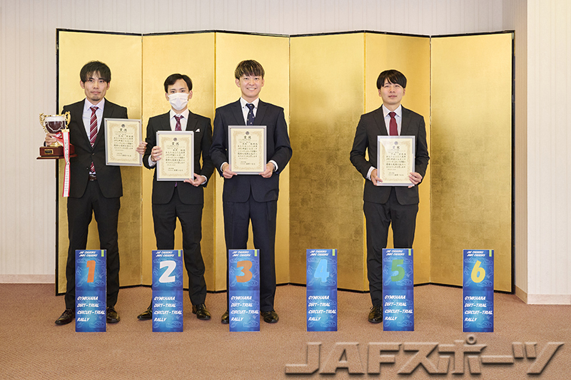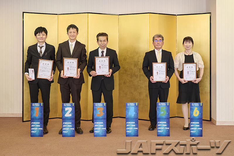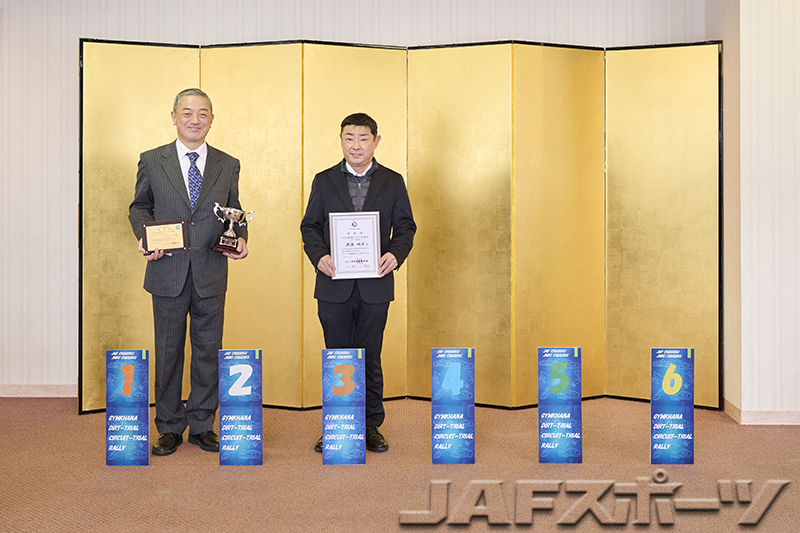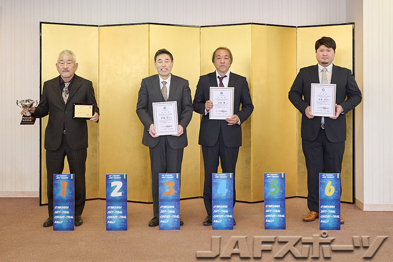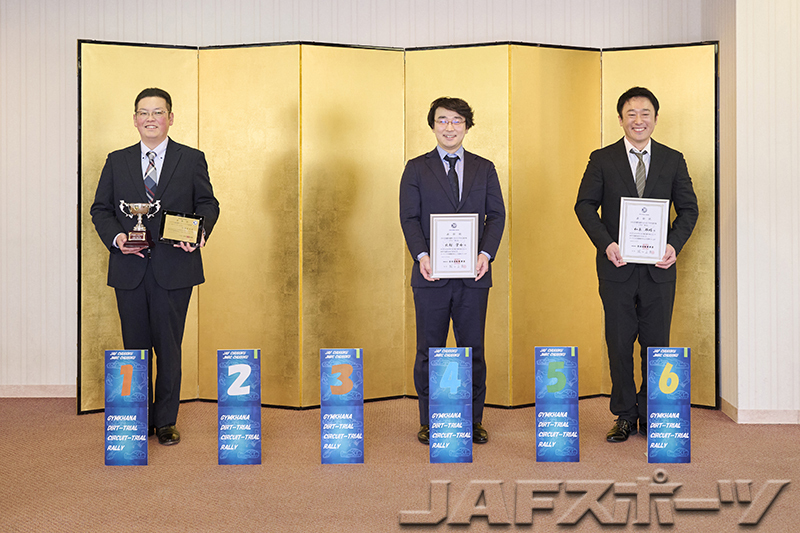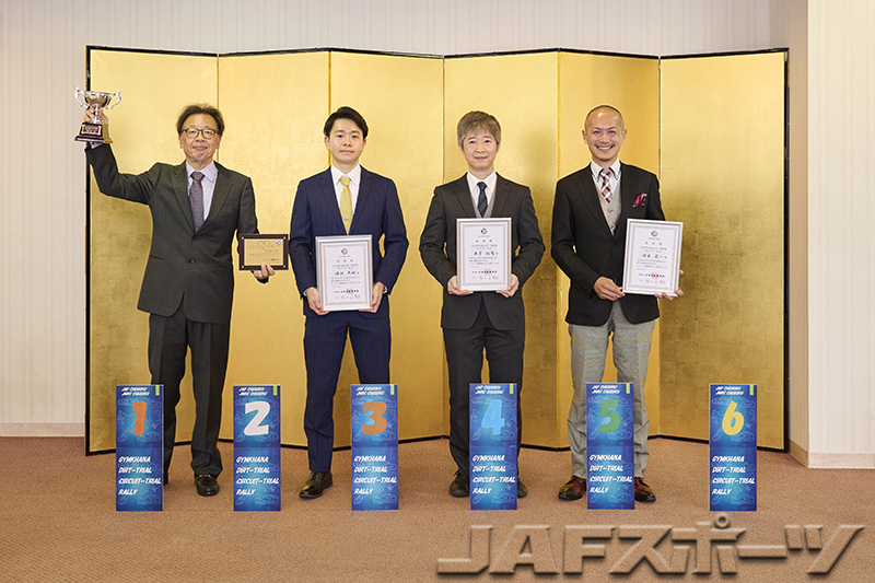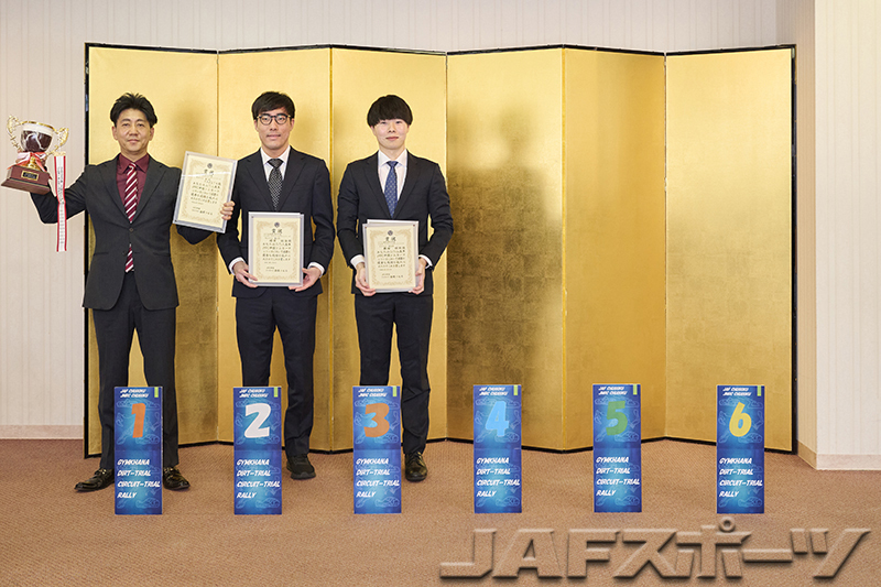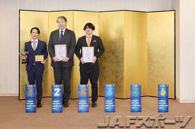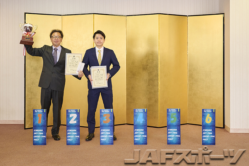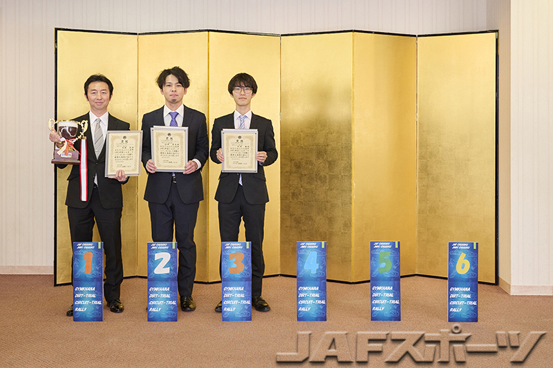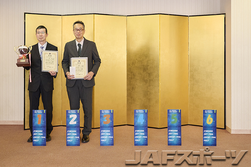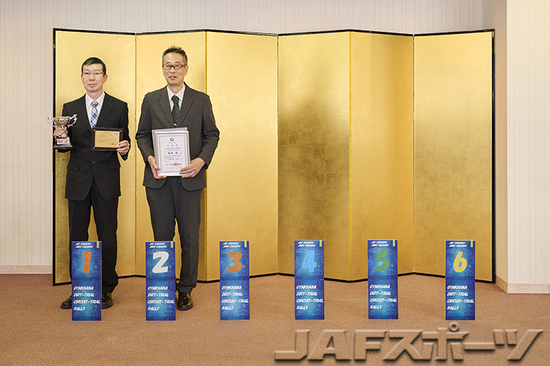 そしてJAF全日本選手権認定者として中国地区が拠点であるジムカーナ、ダートトライアルの上位選手が登壇し、チャンピオンのみJAF本部モータースポーツ部の村田部長やJMRC中国運営委員会の岩根運営委員長から改めてトロフィーが授与される。またJAFカップオールジャパンジムカーナ/ダートトライアルについても入賞者がこの場で登壇して名前が紹介された。