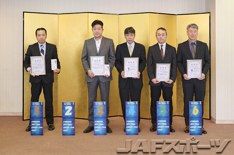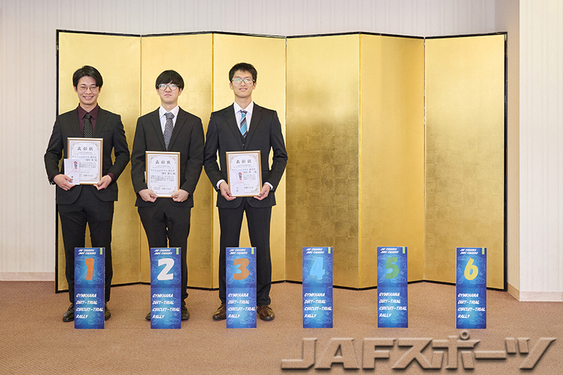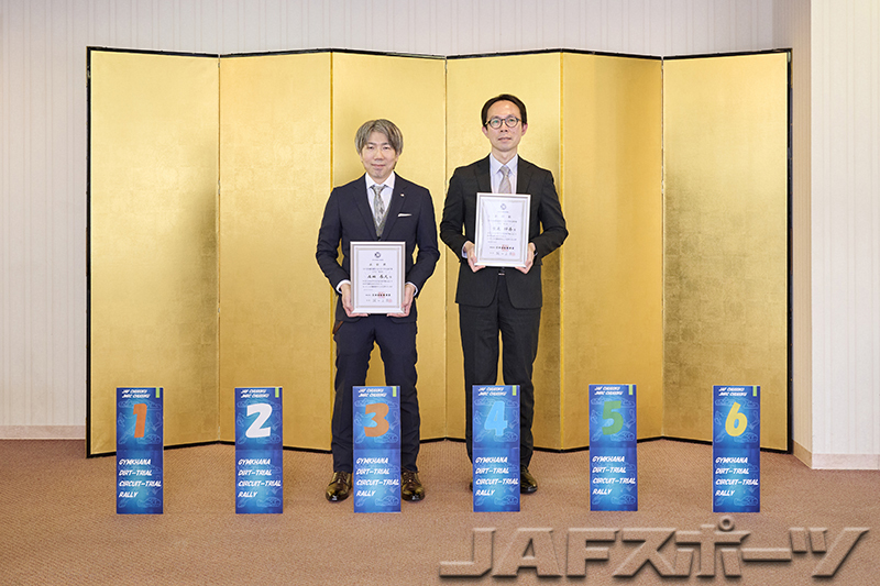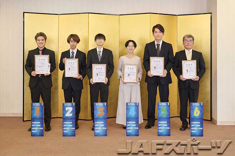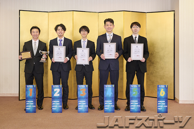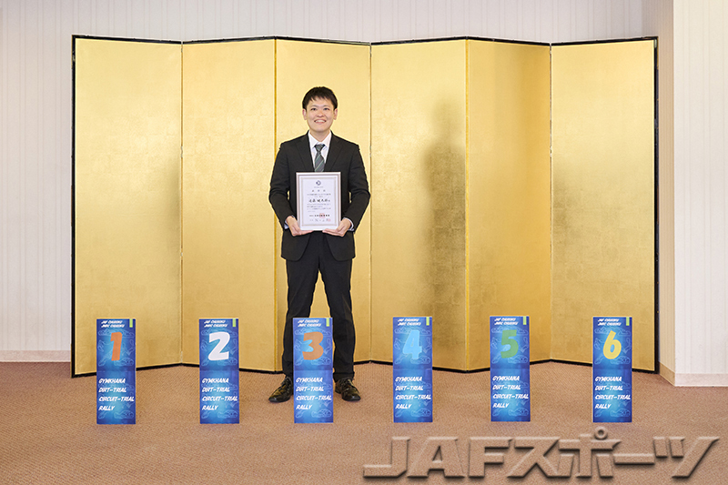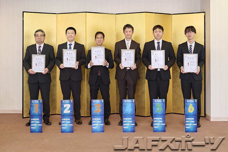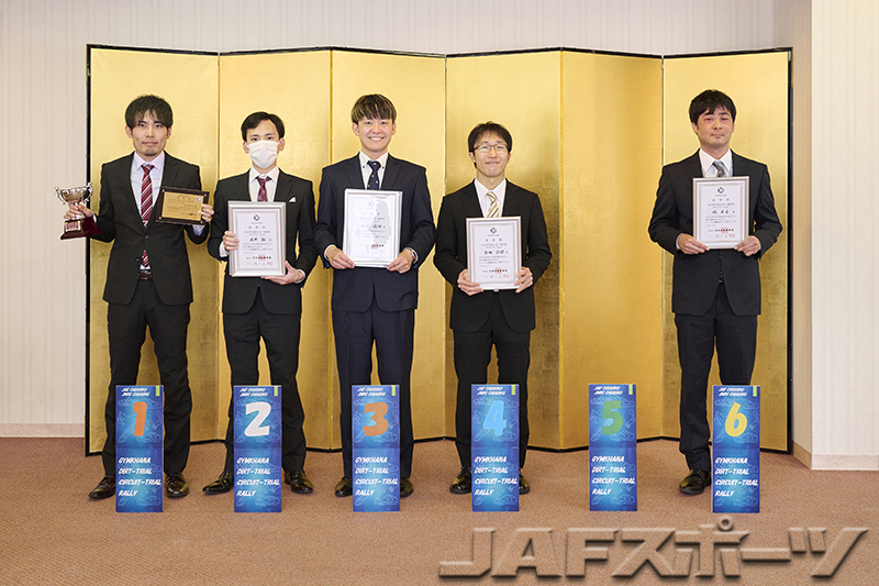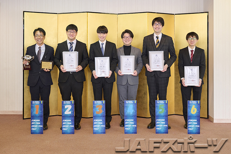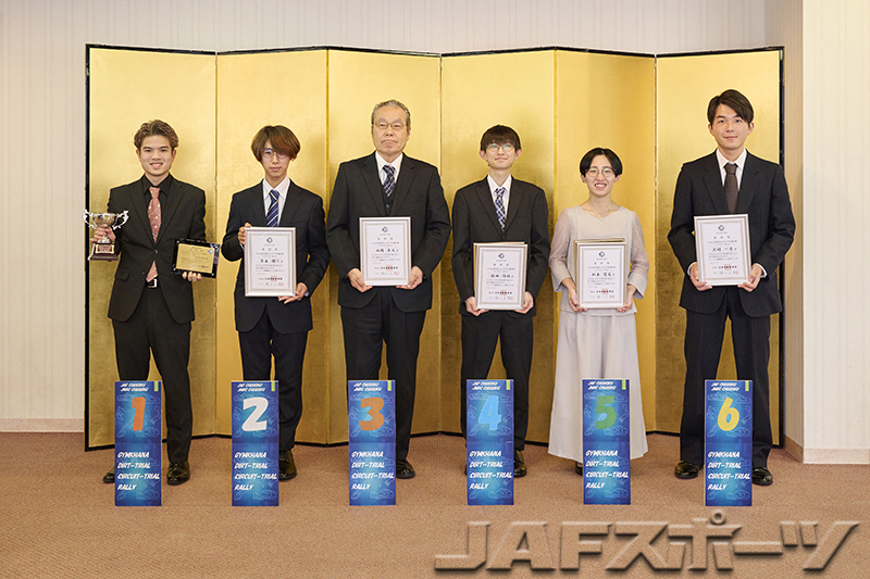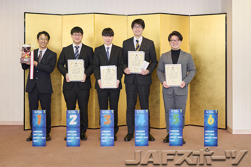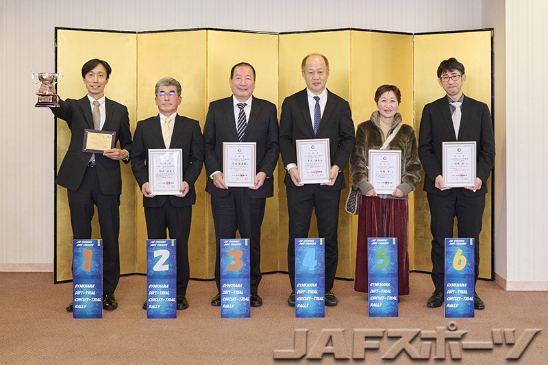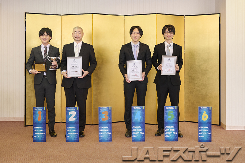 そしてJAF全日本選手権認定者として中国地区が拠点であるジムカーナ、ダートトライアルの上位選手が登壇し、チャンピオンのみJAF本部モータースポーツ部の村田部長やJMRC中国運営委員会の岩根運営委員長から改めてトロフィーが授与される。またJAFカップオールジャパンジムカーナ/ダートトライアルについても入賞者がこの場で登壇して名前が紹介された。