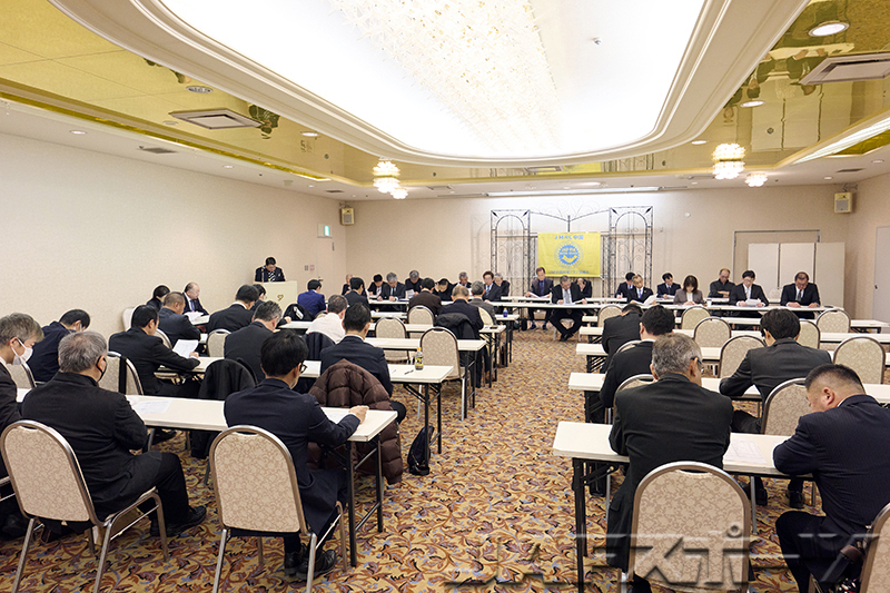 表彰式の後にはジムカーナ/ダートトライアル部会の会議を挟んで、第二部の懇親会となった。表彰式と同じ大宴会場・金銀星で懇親会が行われ、立食形式のビュッフェが振舞われる。開会にあたりJMRC中国運営委員会の原博史運営委員長から「また今年も1年頑張って、今年以上の成績が獲れるように頑張っていただきたいと思います」と激励の言葉。