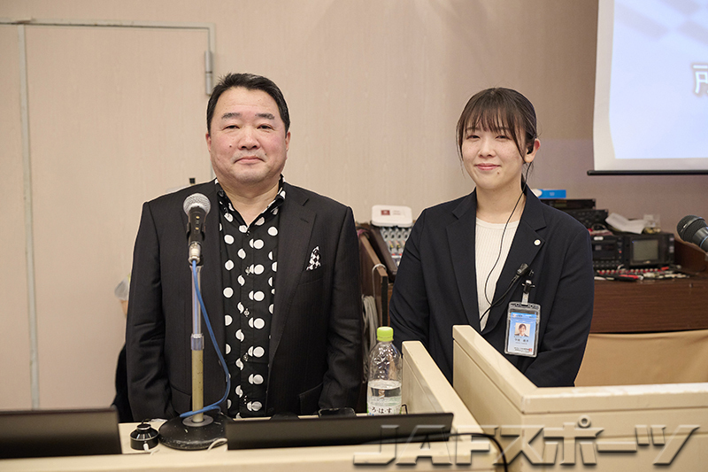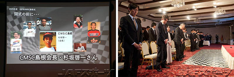 JMRC中国総会と同時に表彰式の受付も開始され、大宴会場・金銀星前のエントランスには多くの表彰対象者や関係者が集まっていた。今年も司会進行は“アナ西元”こと西元直行選手で、JAF広島支部の平岡桃子職員がアシスタントを務める。10時30分から開場した式典の冒頭では、逝去されたコルトモータースポーツクラブ島根の杉坂啓一代表を悼み、黙禱が捧げられた。
