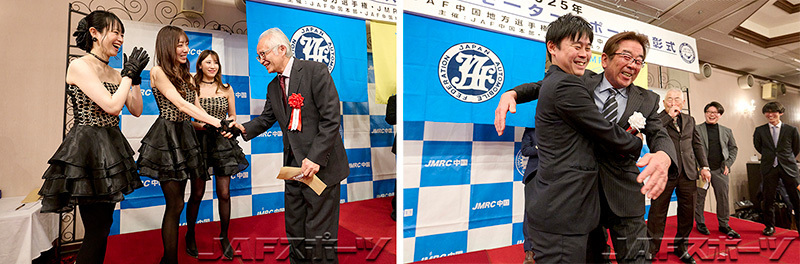 歓談中にはヨコハマタイヤジャパンの徳川氏、住友ゴム工業の畑中氏、フォルテシシモの山内氏がステージに登壇、表彰者に向けて激励を述べつつ自社製品のPRも行った。さらにJMRC九州運営委員会の星野運営委員長、JMRC中国運営委員会の原運営委員長も登壇して、異色のメンバーが揃っての記念撮影が行われた。