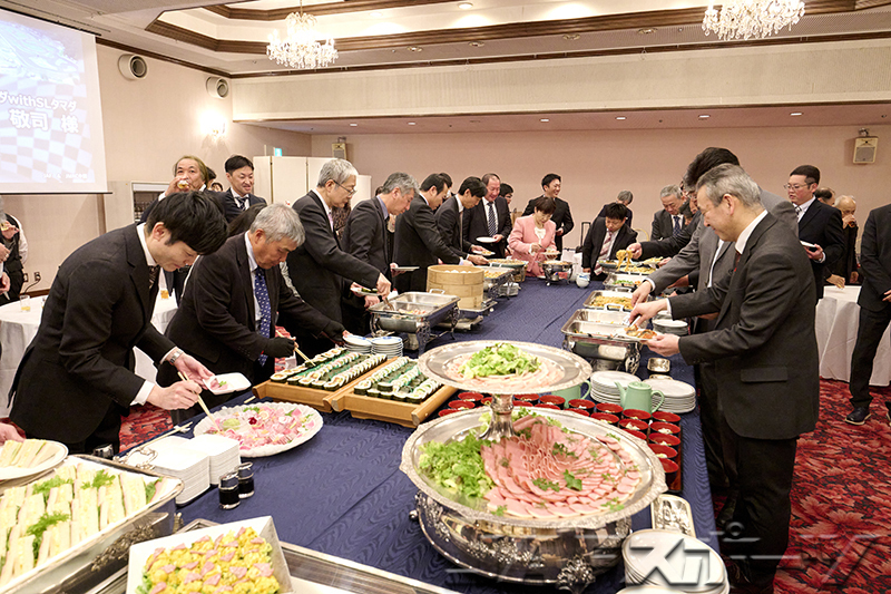 そして乾杯の音頭はスポーツランドタマダの玉田氏で「2026年の皆さまのますますのご繁栄を祈念いたしまして乾杯とします」と言葉を発し、グラスを掲げて「乾杯」の一声で会場の雰囲気が和やかに変わった。色とりどりの野菜やきれいに盛り付けられた肉料理、パスタや巻き寿司、デザートといったビュッフェテーブルの料理を皿に取り、参加者同士で親睦を深める食事を楽しんでいた。